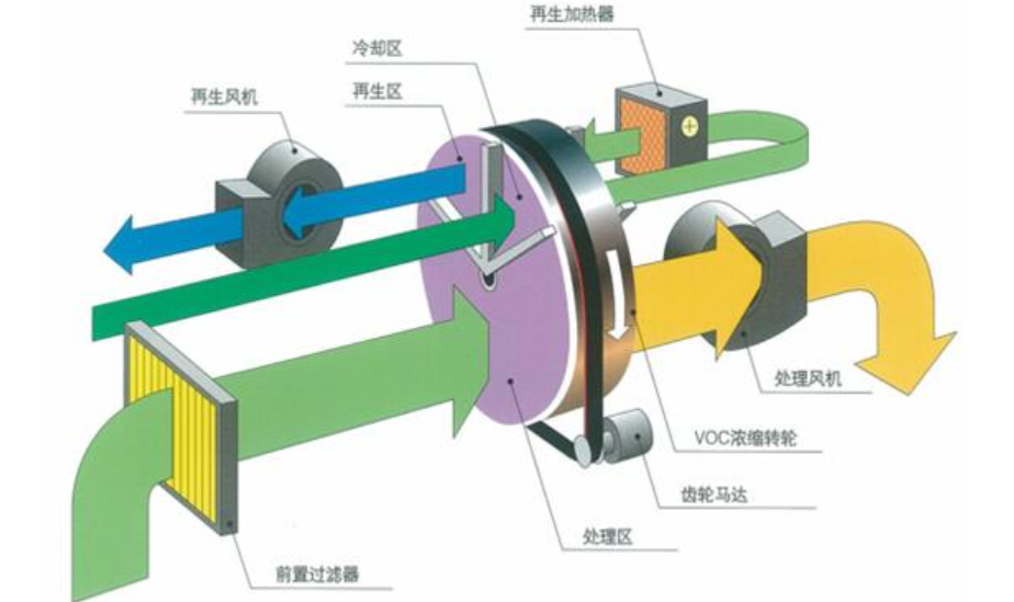 通過轉輪的旋轉,可在轉輪上同時完成氣體的濃縮和沸石的再生。進入濃縮轉輪的有機廢氣在常溫下被轉輪吸附區(qū)吸附凈化后直接排放至大氣,接著因轉輪的轉動而進入脫附區(qū),吸附了有機物質的沸石在此區(qū)內脫附,吸附在沸石上的有機物被分離、脫附、進入后續(xù)處理系統,如此循環(huán)工作。
